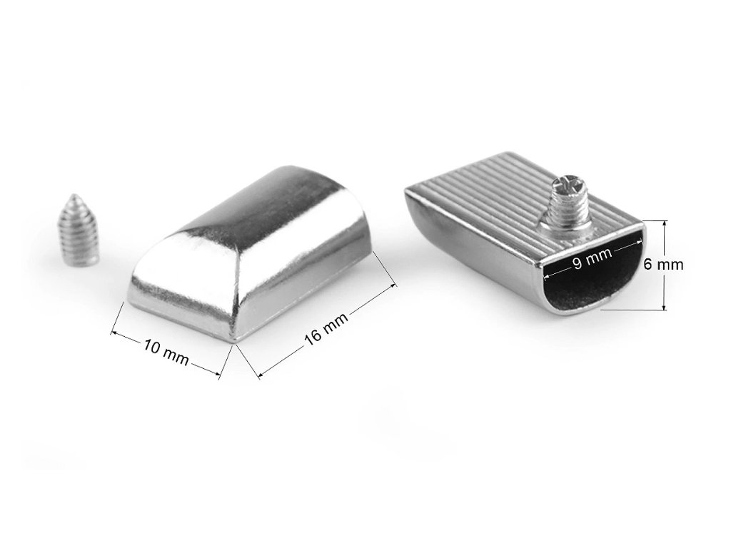 Das elegante Metall-Endstück wird zum sauberen Abschluss von Reißverschlüssen an Handtaschen, Taschen oder Rucksäcken verwendet. Es verdeckt unschöne Enden und wird von unten mit einer kleinen Schraube befestigt, damit es sicher hält.