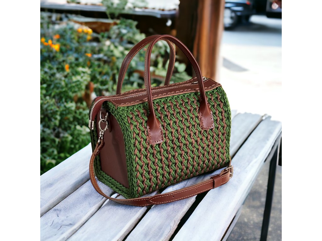 Elegante gehäkelte Tasche ELIZABETH. Komponenten aus echtem Leder, mit Baumwollfutter und einer Tasche. Die Tasche wird mit einem Reißverschluss geschlossen. Ein zusätzlicher langer, verstellbarer Riemen von 120x2 cm ist ebenfalls erhältlich.