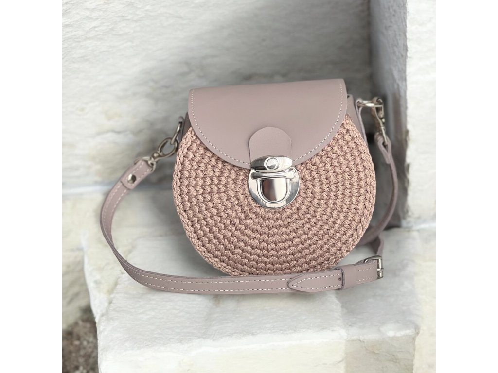 Elegante gehäkelte Handtasche. Klappe mit Verschluss, Seite und Riemen aus echtem Leder. Sie können sie entweder über der Schulter oder quer über den Körper als Umhängetasche tragen. Länge des Riemens 120 cm.
