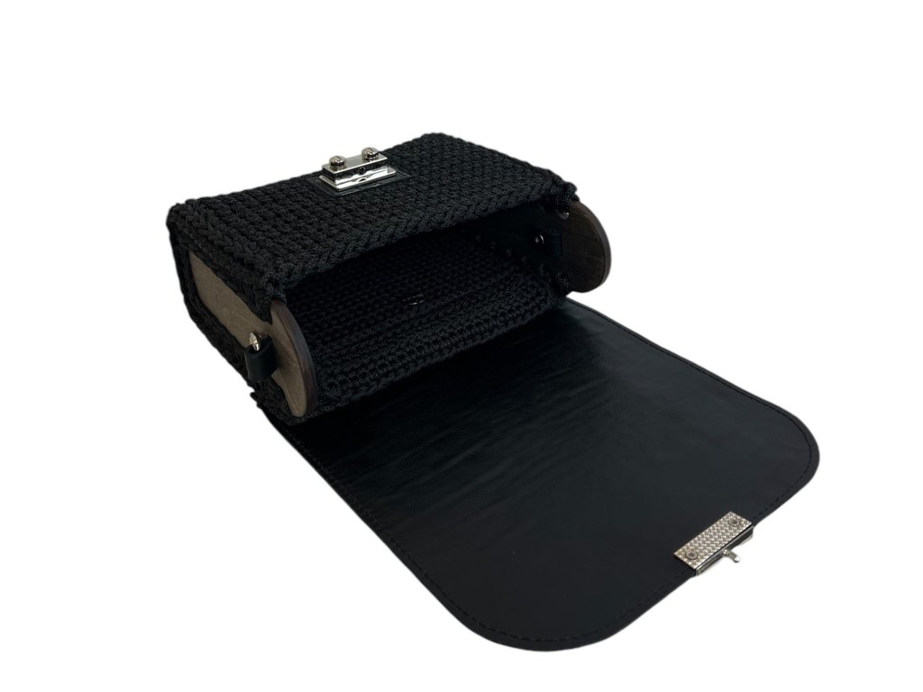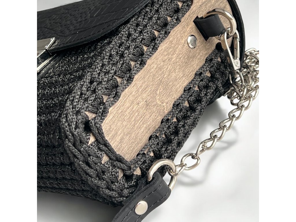 Elegante gehäkelte Handtasche mit Seitenteilen aus Holz. Klappe mit Verschluss und Riemen aus echtem Leder. Sie können sie entweder auf der Schulter oder quer über den Körper als Crossbody tragen. Länge des Riemens 120 cm.