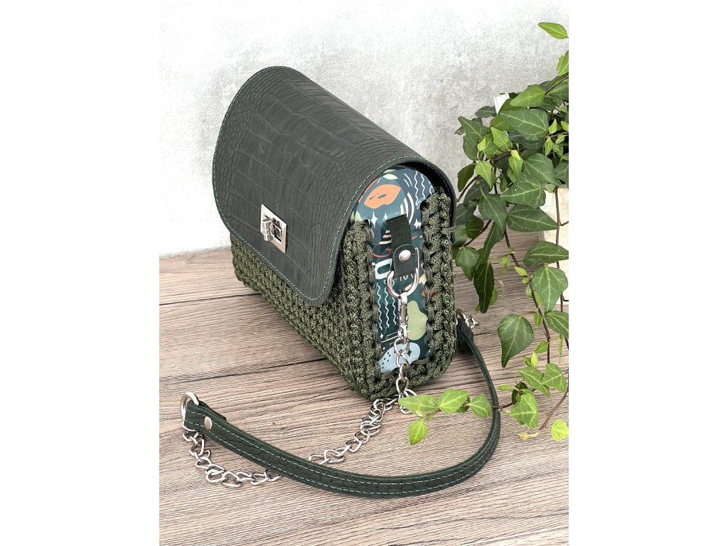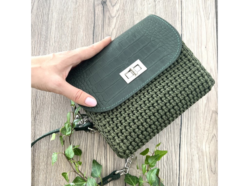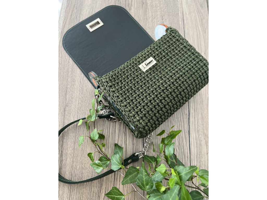 Elegante gehäkelte Handtasche mit Acrylseitenwänden. Klappe mit Verschluss und Riemen aus echtem Leder. Sie können sie entweder auf der Schulter oder quer über den Körper als Crossbody tragen. Länge des Riemens 120 cm.