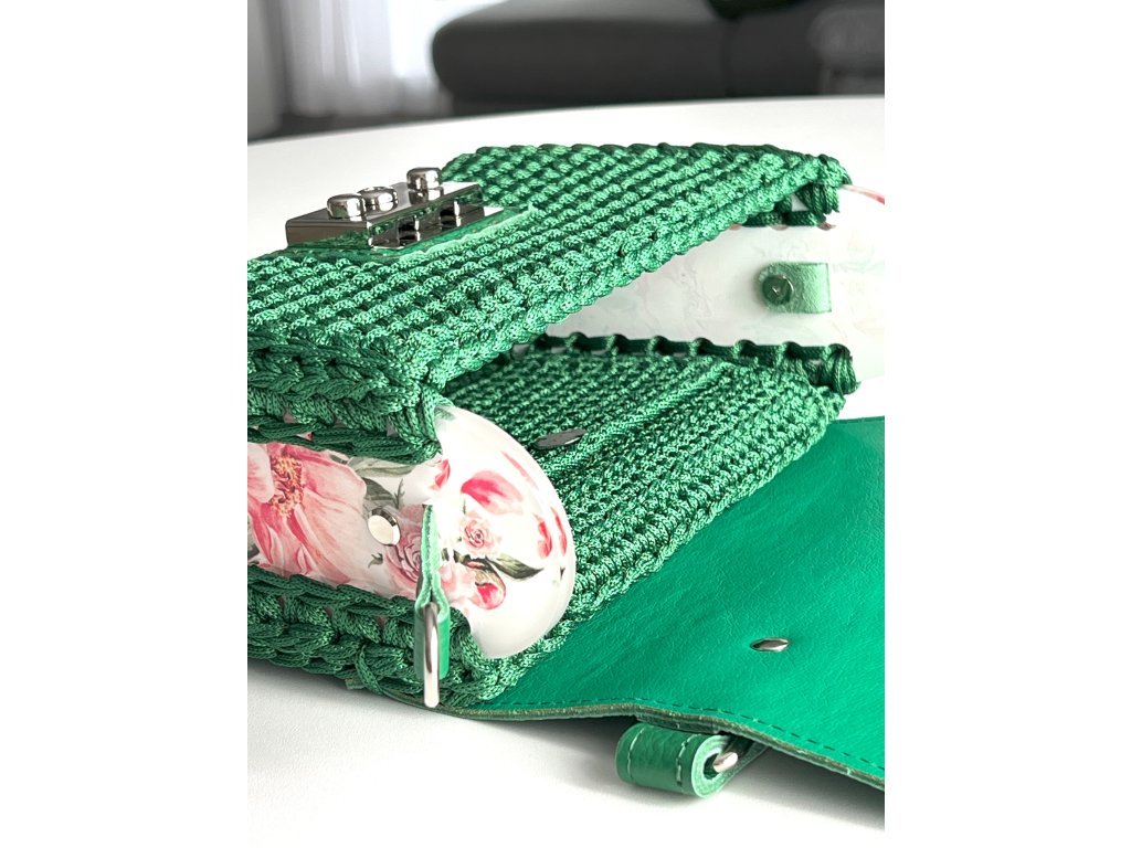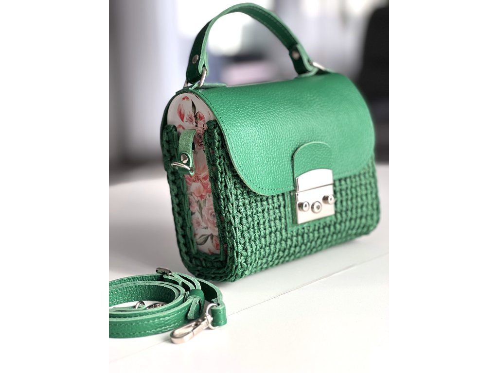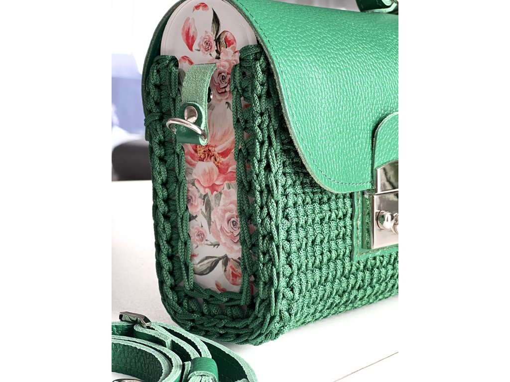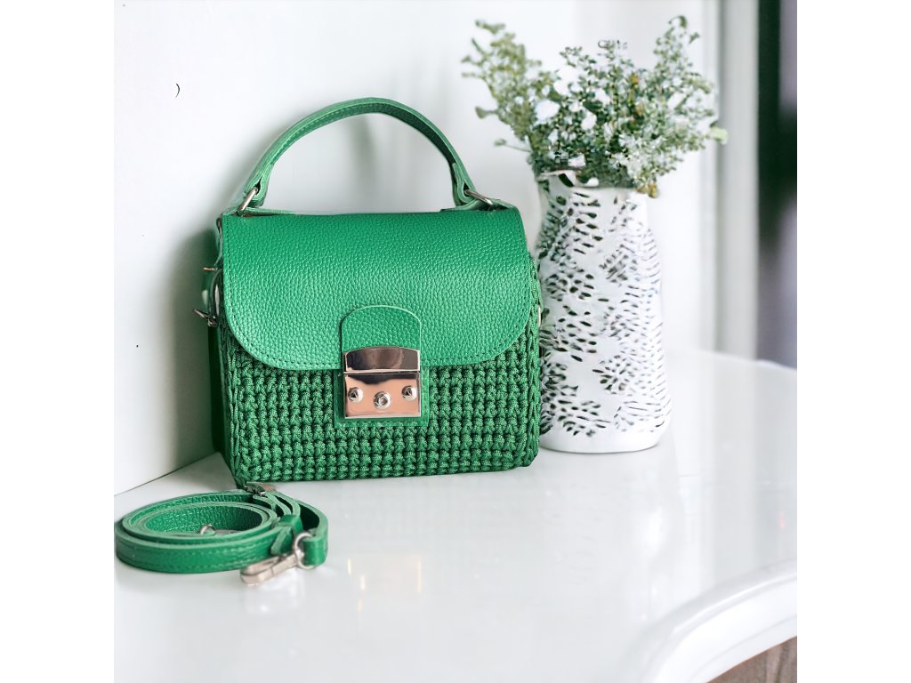 Elegante gehäkelte Handtasche mit Acrylseitenwänden. Klappe mit Verschluss und Riemen aus echtem Leder. Sie können sie entweder auf der Schulter oder quer über den Körper als Crossbody tragen. Länge des verstellbaren Riemens 120 cm.