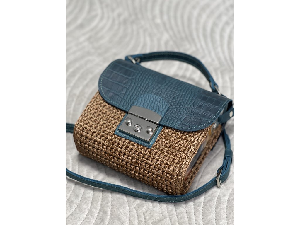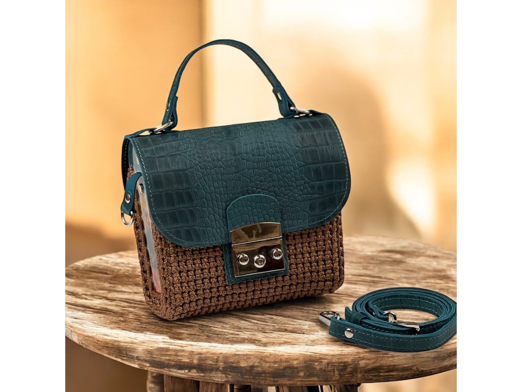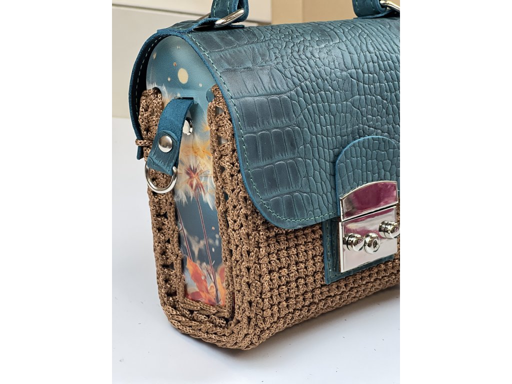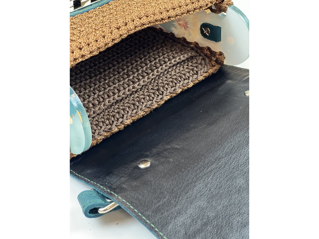 Elegante gehäkelte Handtasche mit Acrylseitenwänden. Klappe mit Verschluss und Riemen aus echtem Leder. Sie können sie entweder auf der Schulter oder quer über den Körper als Crossbody tragen. Länge des verstellbaren Riemens 120 cm.