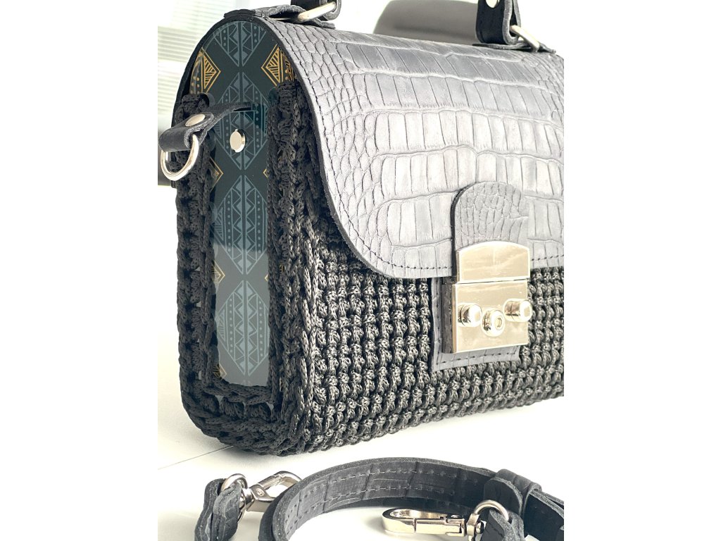 Elegante gehäkelte Handtasche mit Acrylseitenwänden. Klappe mit Verschluss und Riemen aus echtem Leder. Sie können sie entweder auf der Schulter oder quer über den Körper als Crossbody tragen. Länge des verstellbaren Riemens 120 cm.