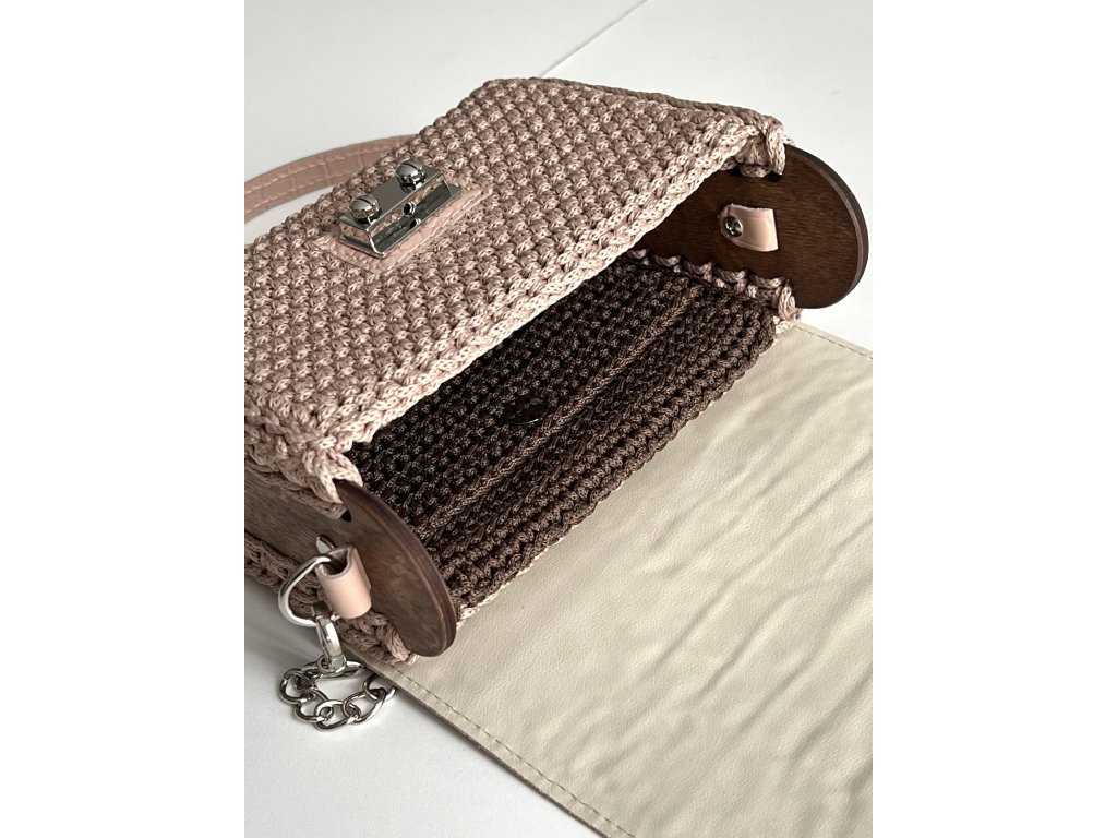 Elegante gehäkelte Handtasche mit Seitenteilen aus Holz. Klappe mit Verschluss und Riemen aus echtem Leder. Sie können sie entweder auf der Schulter oder quer über den Körper als Crossbody tragen. Länge des Riemens 120 cm.