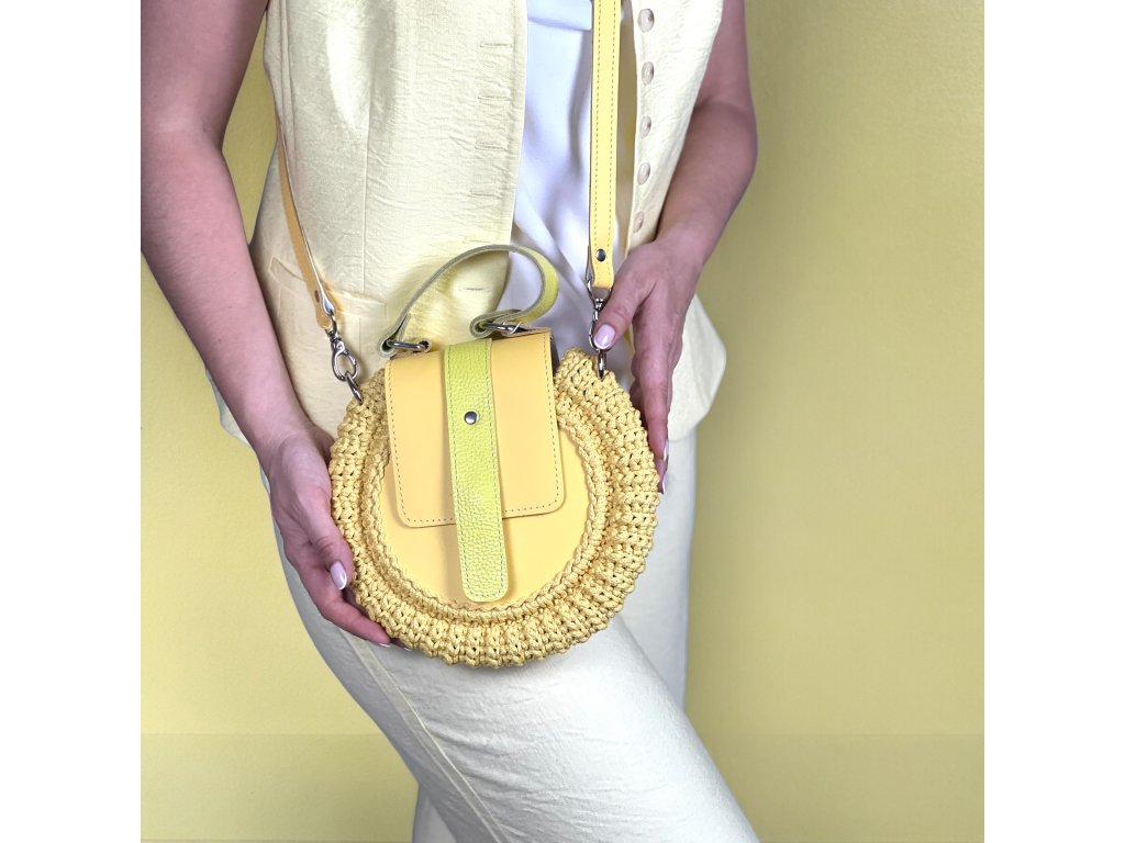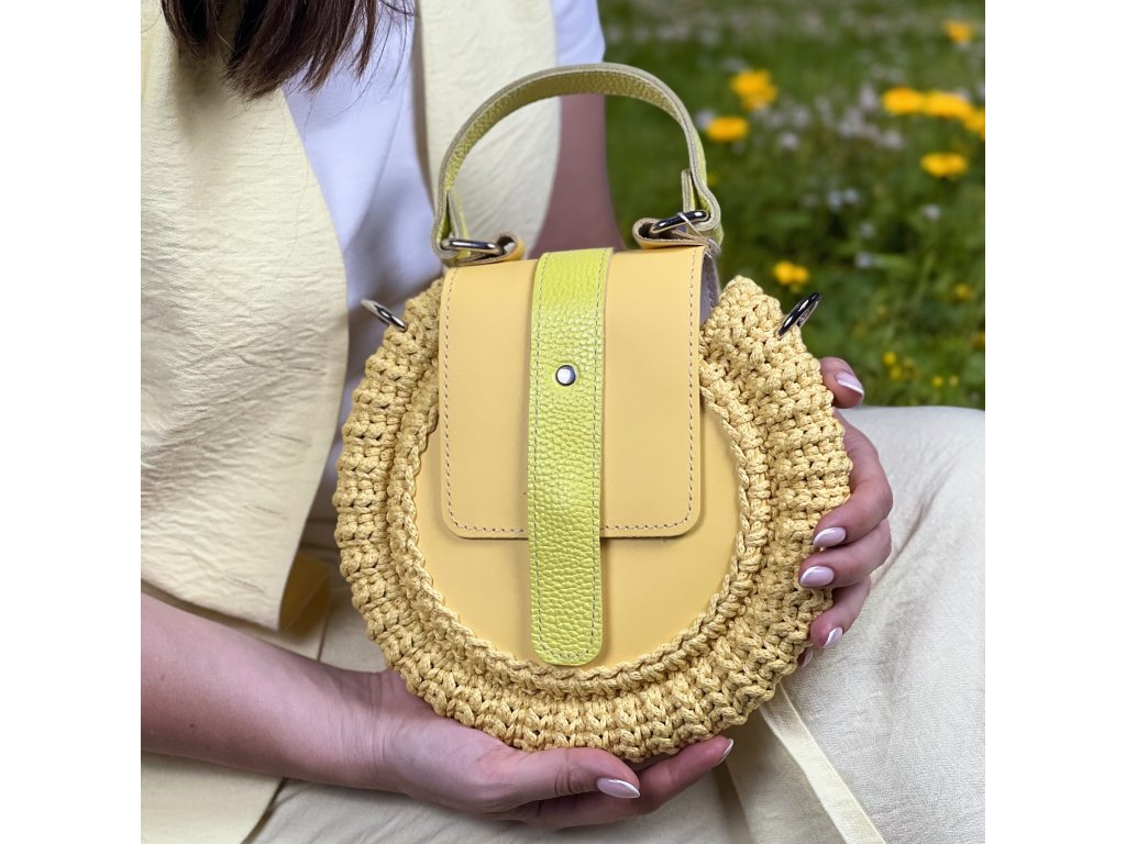 Elegante gehäkelte Handtasche. Klappe mit Verschluss, Rückseite und Riemen aus echtem Leder. Sie können sie entweder auf der Schulter, quer über den Körper als Crossbody oder in der Hand tragen. Länge des Riemens 120 cm.