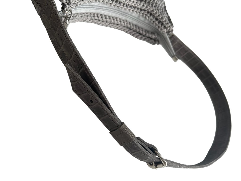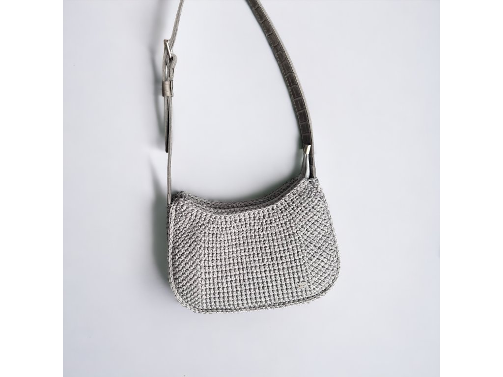Elegante gehäkelte Handtasche LOREN. Boden, Riemen aus echtem Leder. Die Tasche wird mit einem Reißverschluss geschlossen.