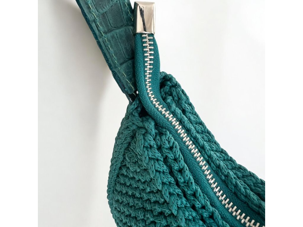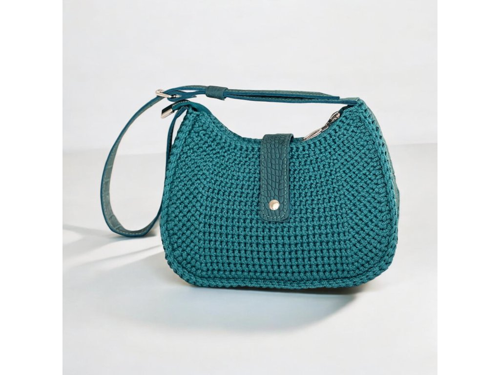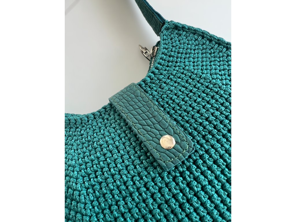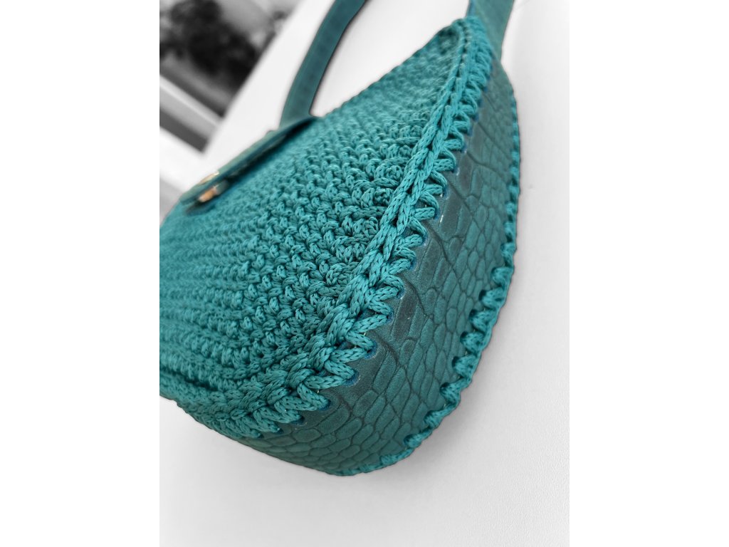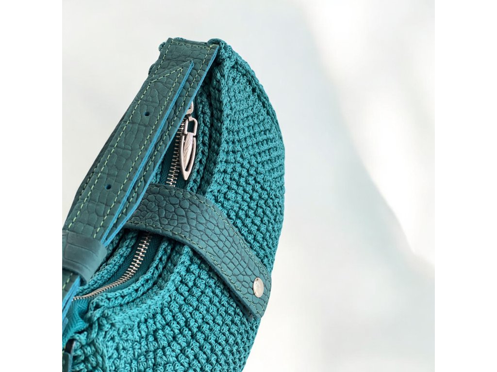 Elegante gehäkelte Handtasche LOREN. Boden, Riemen aus echtem Leder. Die Tasche wird mit einem Reißverschluss und einem Magnetverschluss geschlossen.