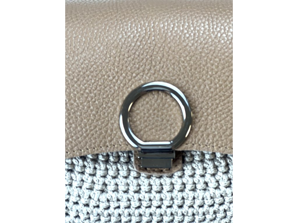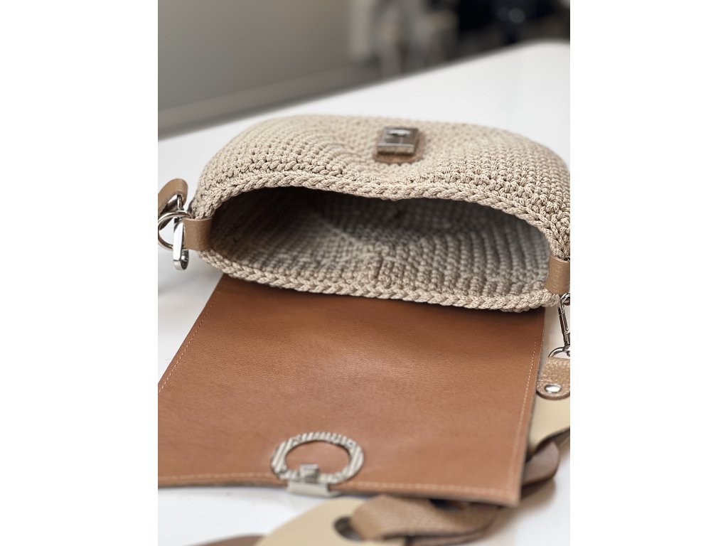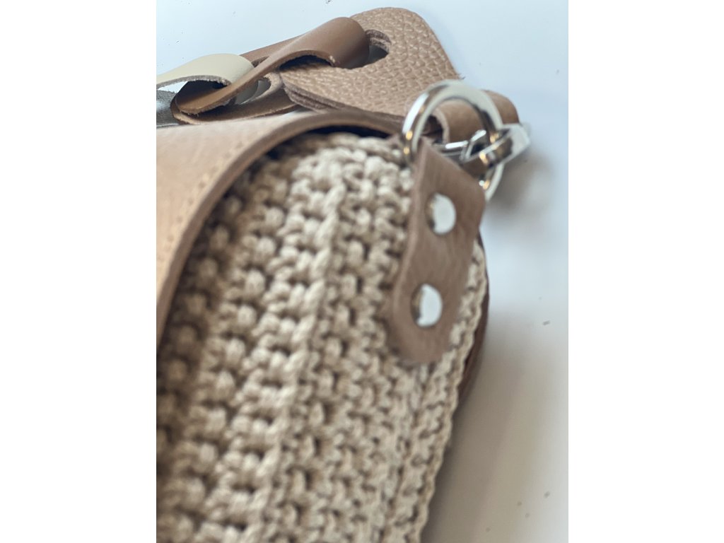 Elegante gehäkelte Handtasche. Klappe mit Verschluss und Riemen aus echtem Leder. Sie können sie entweder über der Schulter tragen. Länge des Riemens 80 cm Lederteil (Gesamtlänge mit Karabinern 88 cm)
