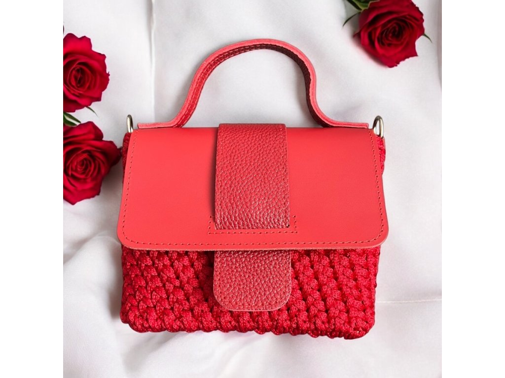 Elegante gehäkelte Handtasche. Klappe mit Verschluss, Boden und Riemen aus echtem Leder. Sie können sie entweder auf der Schulter oder quer über den Körper als Crossbody tragen. Länge des Riemens 120 cm.
