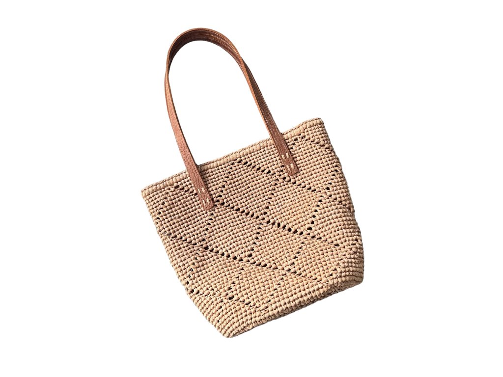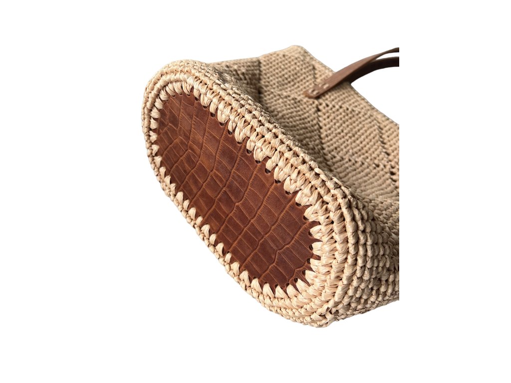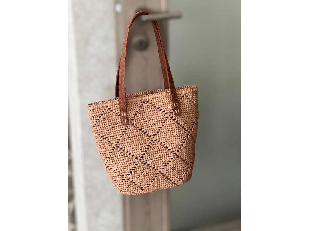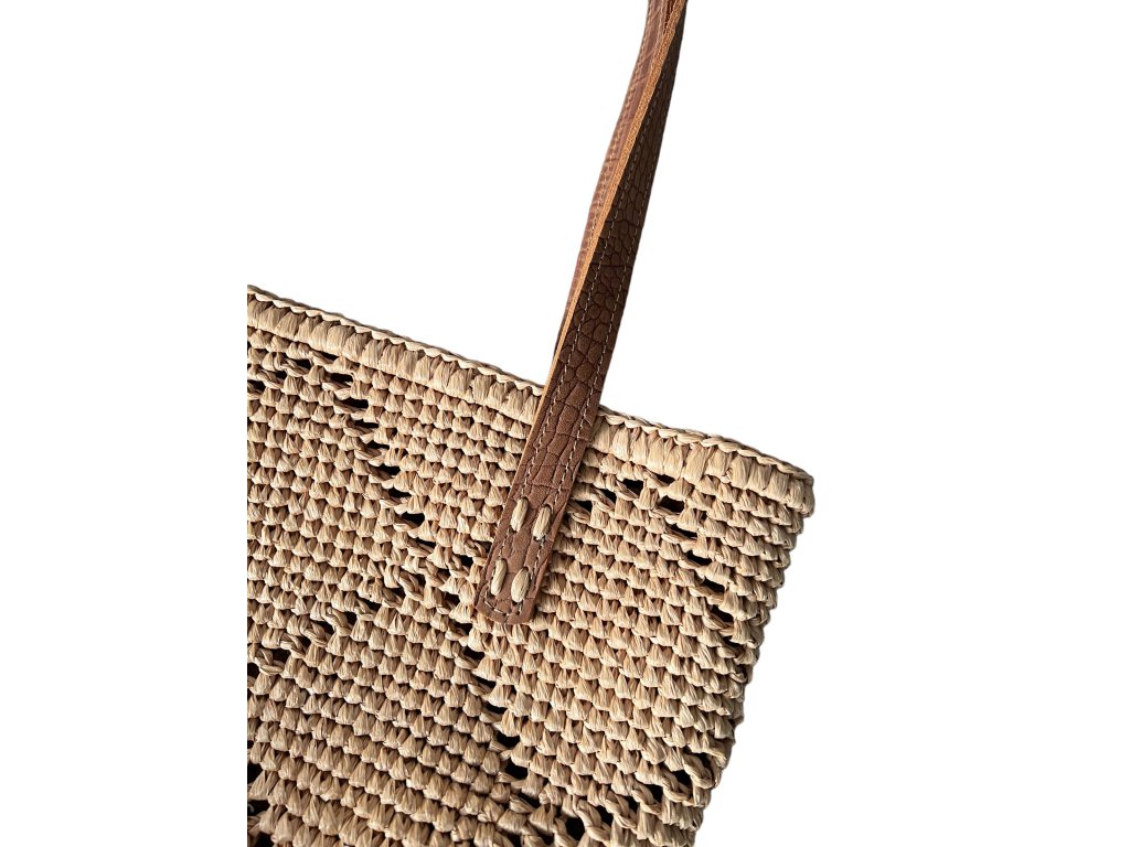 Elegante gehäkelte Tasche VOYAGE. Boden und Riemen aus echtem Leder. Sie können sie entweder über der Schulter oder in der Hand tragen.