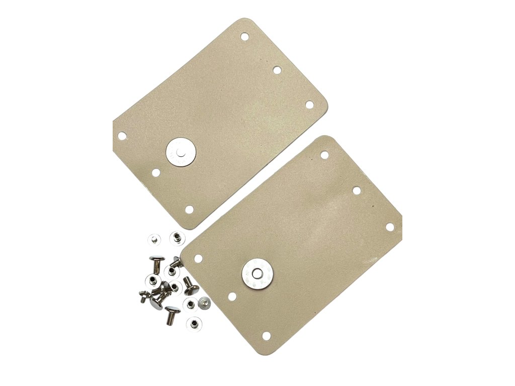 Magnetverschluss mit Schrauben ist in ein Rechteck aus Leder eingesetzt. Er besteht aus zwei Teilen, die verschraubt werden und aneinander gedrückt werden.