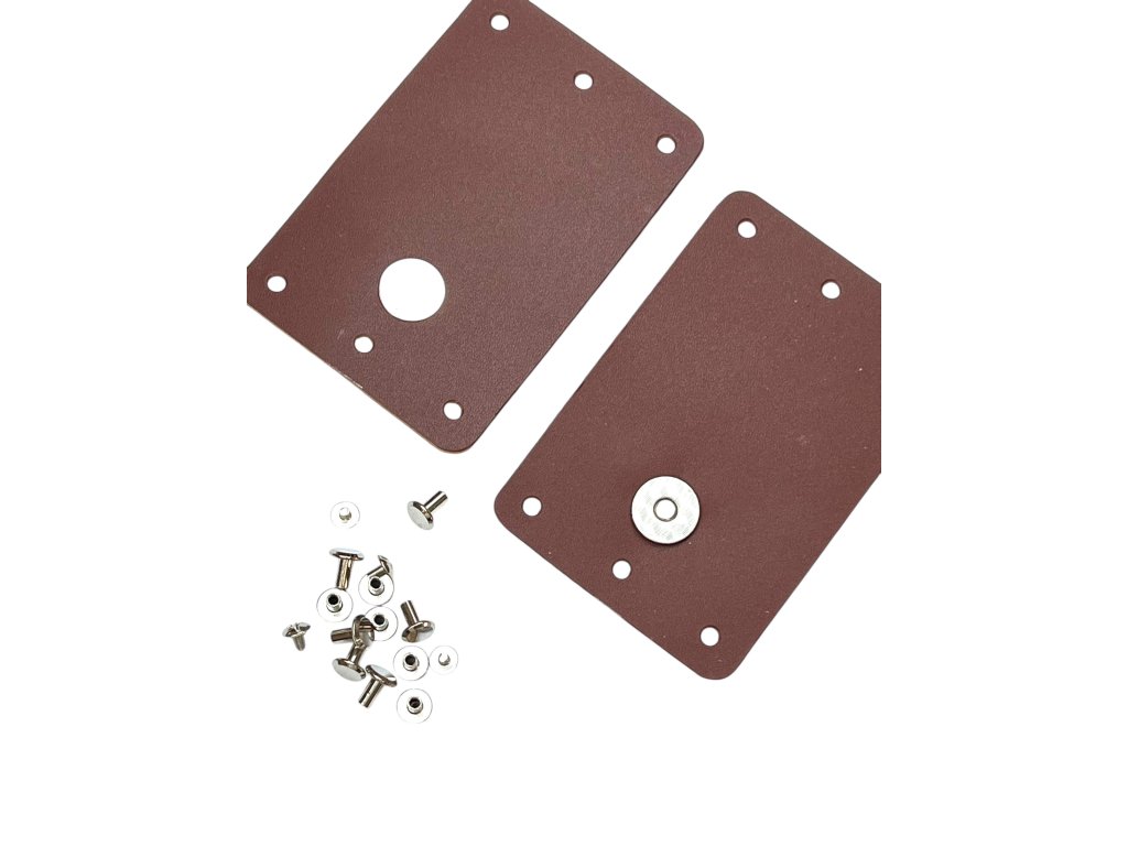Magnetverschluss mit Schrauben ist in ein Rechteck aus Leder eingesetzt. Er besteht aus zwei Teilen, die verschraubt werden und aneinander gedrückt werden.