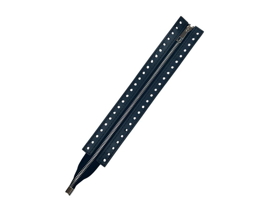 Metallreißverschluss für Handtasche oder Tasche, in Leder eingesetzt, Rückseite mit Kunstleder gefüttert.