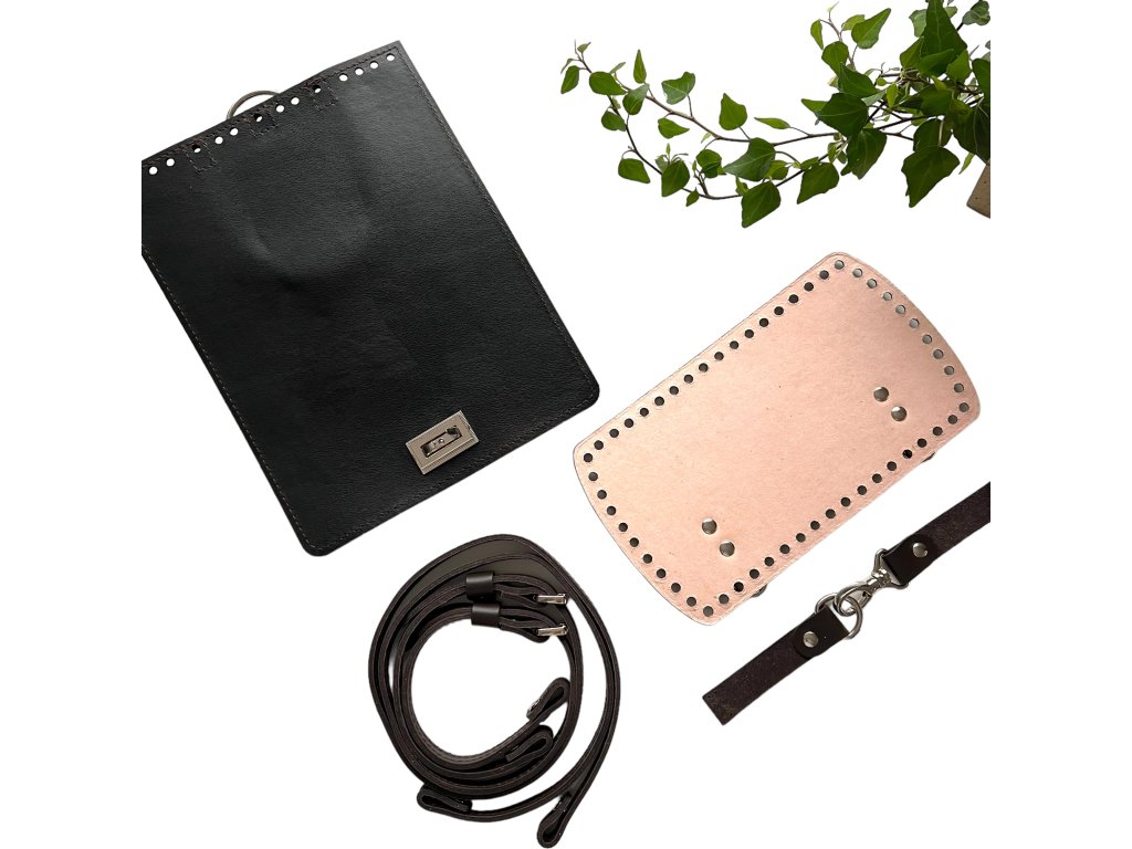 - Klappe mit Verschluss 26*20 cm, Farbe der Rückseite schwarz, 15 vorgestanzte Löcher 3 mm, kurzer Griff 28*1,7 cm, zwei Lederschichten