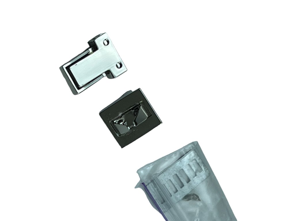 Der untere Teil des Schlosses, mit Klinke, 20*22 mm Er wird mit zwei 10 mm langen Befestigungsbügeln und einer Metallplatte an der Basis der Tasche befestigt