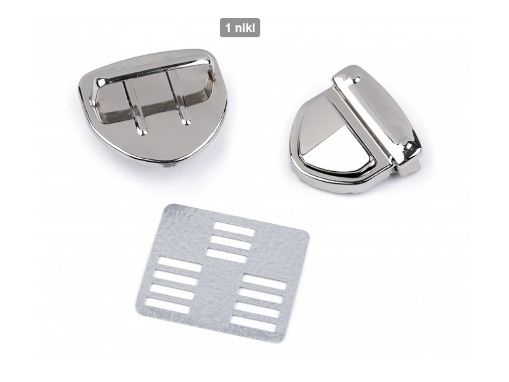 Der klassische Verschluss für Handtaschen oder Taschen besteht aus drei Teilen. Die Lasche wird an der Innenseite der Tasche befestigt, das Teil mit den Füßen an der Außenseite (die Füße werden in die Lasche eingehakt und gespreizt) und das dritte Teil mit den Zähnen an der Klappe. Das Klappenteil wird befestigt, indem Sie die Backen öffnen, an denen sich die Zähne befinden, und das Material dazwischen einführen, an dem Sie den Verschluss befestigen möchten. Anschließend die Backen schließen, die Zähne verhindern so die Bewegung des Stoffes.