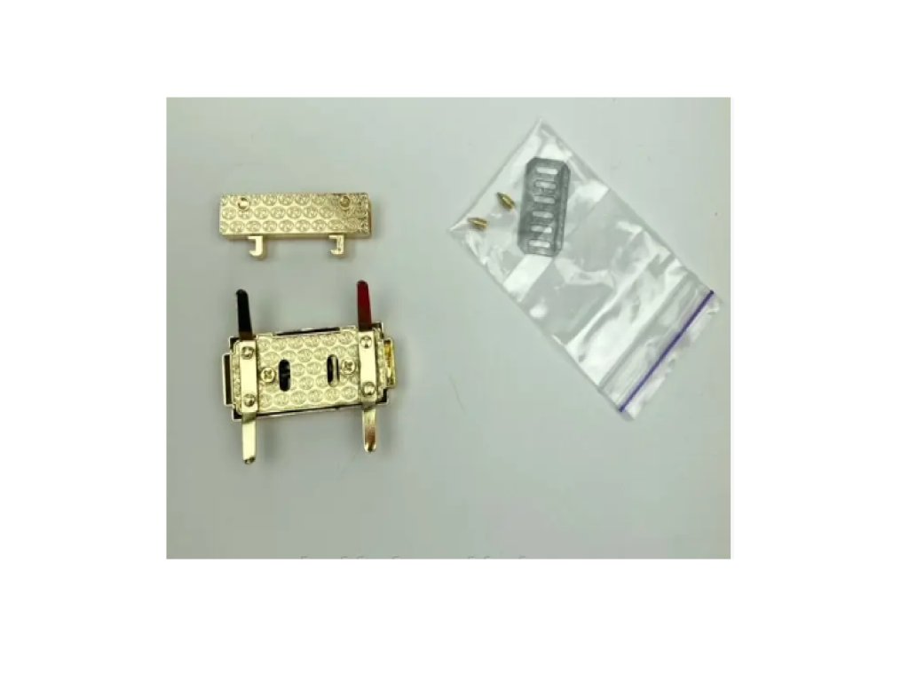 Unterteil des Schlosses mit Riegel, 49*21 mm, der sich durch leichtes Drücken nach links schließt. Es wird mit vier 13 mm langen Befestigungsantennen und zwei Platten an der Taschenbasis befestigt