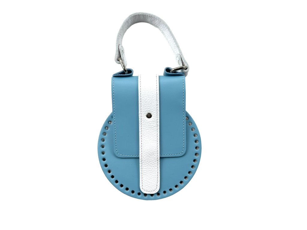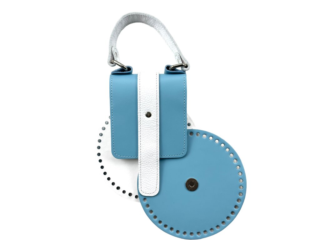 - Hinteres Teil Durchmesser 15,8 cm, Klappe mit Magnetverschluss 24*10,5 cm, Farbe der Rückseite weiß, 46 vorgestanzte Löcher 4 mm und Griff in zwei Lederschichten 23*2,7 cm