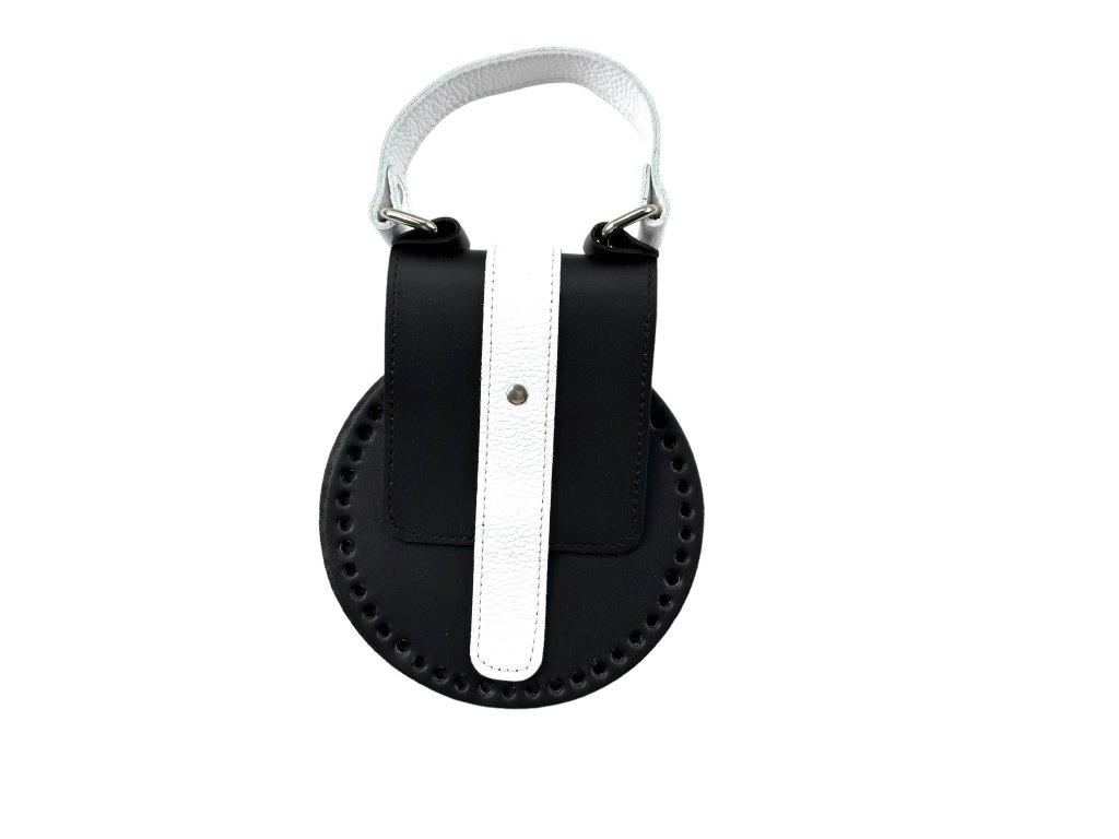 - Hinteres Teil Durchmesser 15,8 cm, Klappe mit Magnetverschluss 24*10,5 cm, Farbe der Rückseite schwarz, 46 vorgestanzte Löcher 4 mm und Griff in zwei Lederschichten 23*2,7 cm